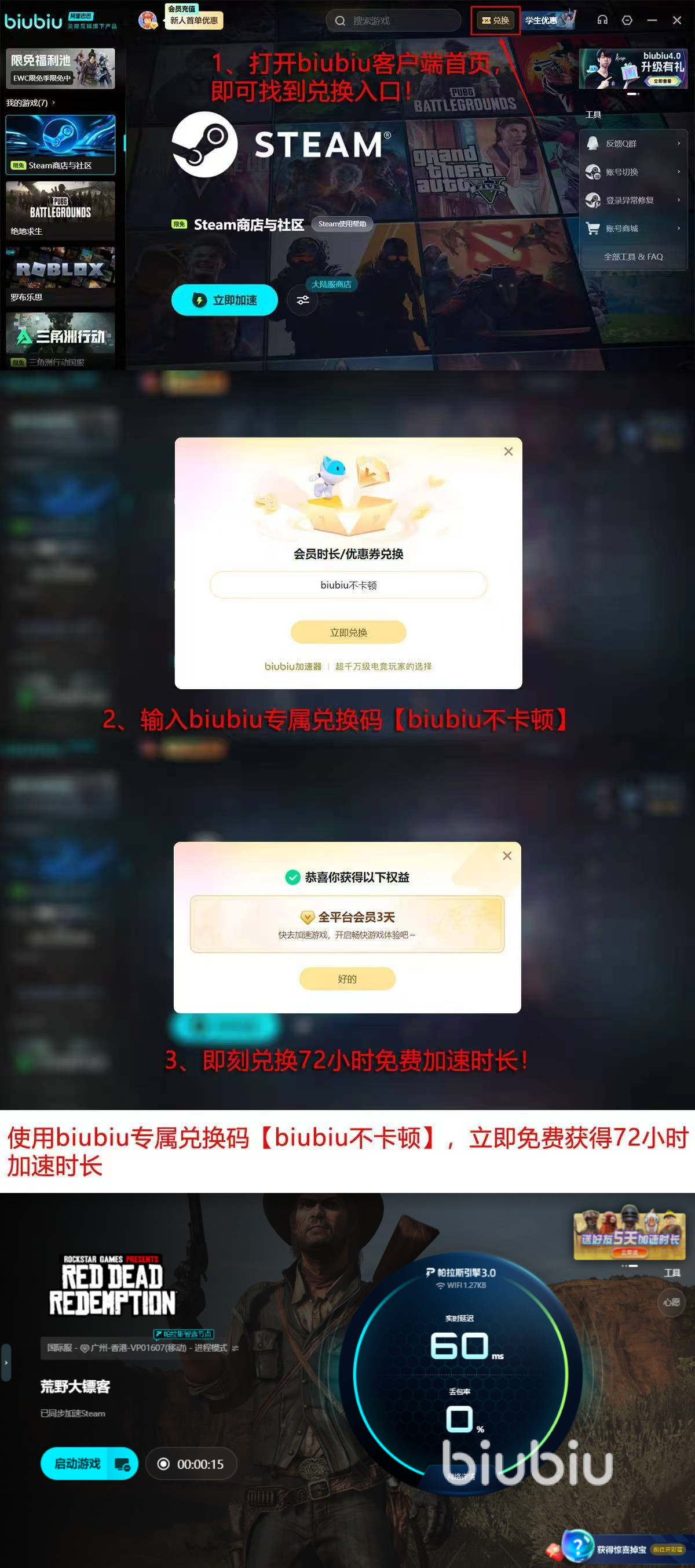对新玩家而言,biubiu加速器给予丰厚的新用户礼遇,达成注册之后立刻便得到首日24小时全功能免费试用,输入【biubiu不卡顿】就能解锁额外72小时免费加速时长,成功激活后新用户会拥有多4天顶级加速服务时间,帮助大家快速解决西部世界的网络问题。