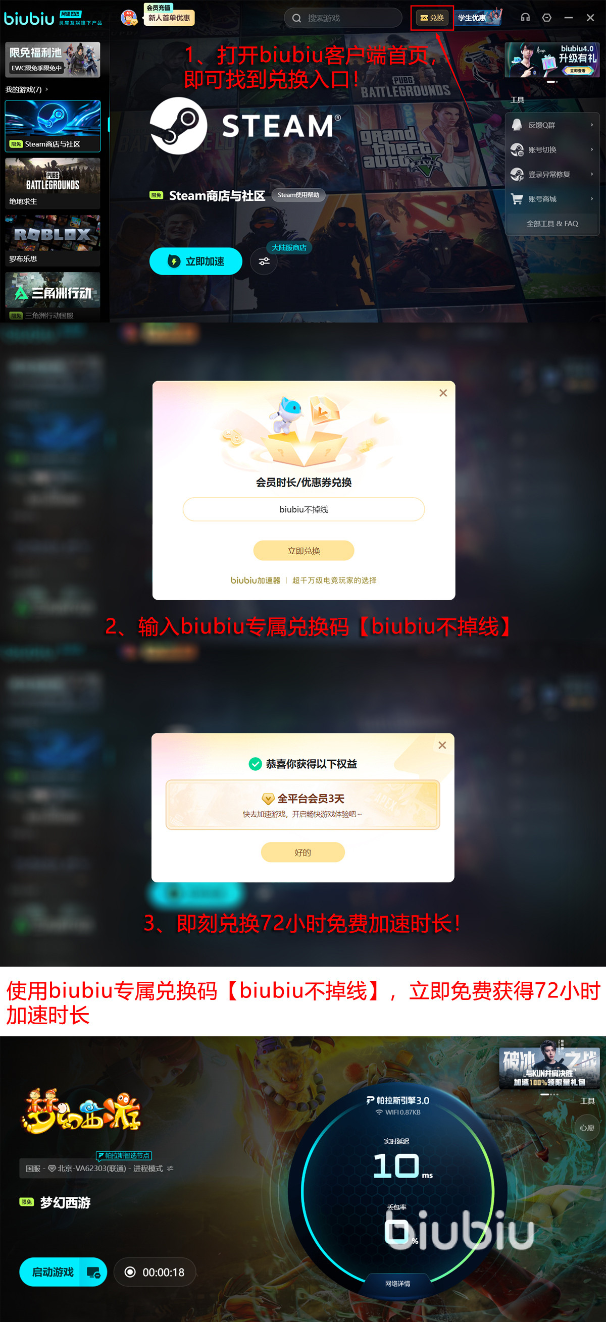 新用户可享受阶梯式免费体验权益:完成注册并登录后,立即解锁24小时全游戏加速权限;再输入兑换口令【biubiu不掉线】,即可追加72小时服务时长。两项叠加,最高可获得96小时无门槛加速体验。