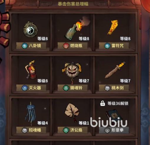 其一为法器系统。达成对应条件后可激活不同功能法器,其中八卦镜(提供范围反伤与减益扩散)与招魂蟠(随轮回次数提升持续增益层数)属于后期强度跃升最显著的两类,建议早期预留升级资源重点培养。