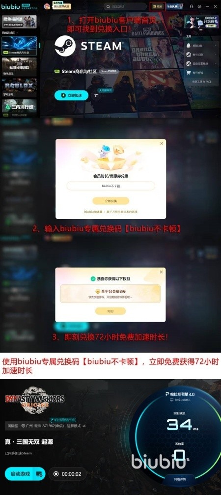 面向新用户,biubiu加速器提供双重入门权益:注册即赠24小时全游戏通用加速时长;输入专属兑换码【biubiu不卡顿】,还可额外领取72小时高级加速权限。