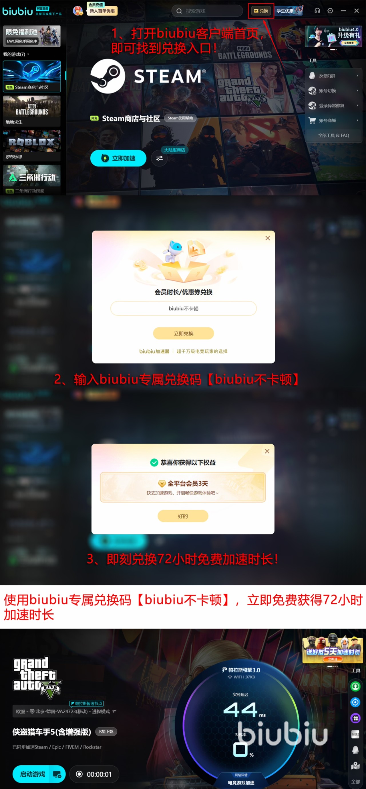 选择biubiu来加速的话,别忘了来领取下相关的加速福利。对于新人用户而言,只要完成了注册和登录之后,直接就获得了24h的vip时间,在这个时间段内玩家可以对加速器游戏库内任一一款游戏加速。新老用户都可以用【biubiu不卡顿】解锁3天的加速时间。