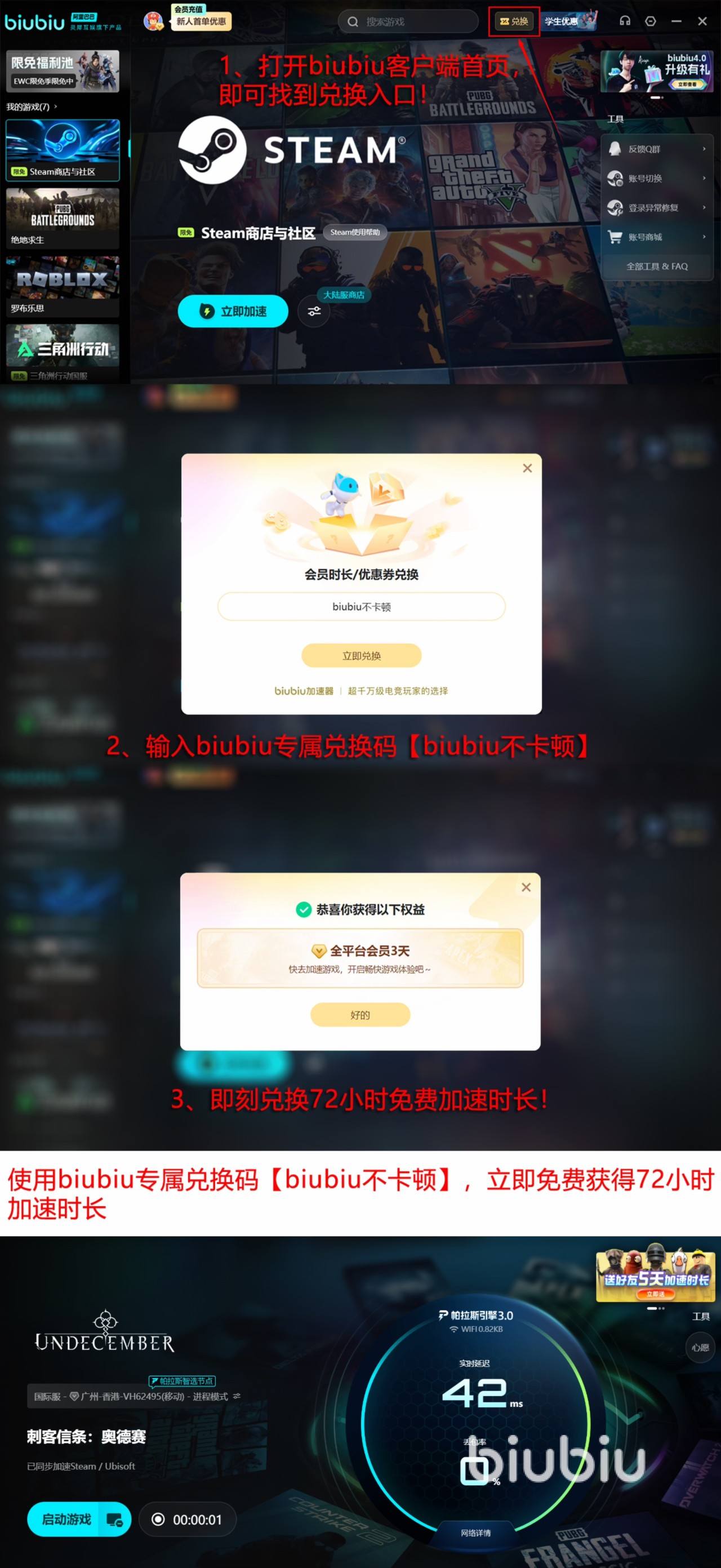 除了加速好用之外,加速器上的福利也很不错。新人用户可以直接获得24h的加速,新老用户都可以用【biubiu不卡顿】这个口令,在加速器上拿到3天时间的加速。除了这些之外,还有一些限时的充值优惠。