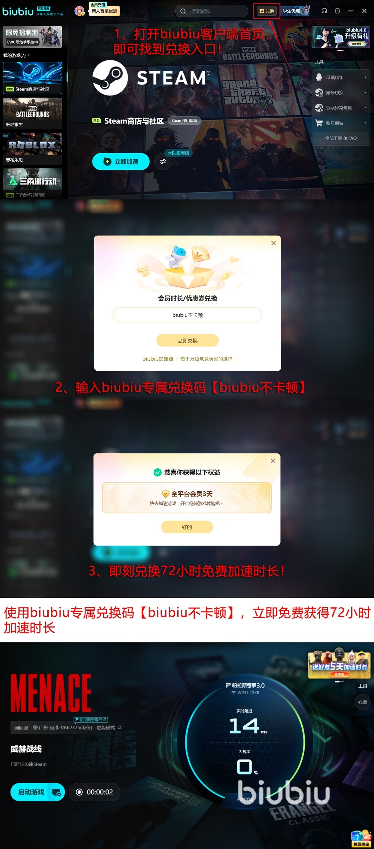 目前该工具凭借其赛事级的稳定表现,已经成为pero战队指定用的加速工具,能够顶尖职业战队在高强度训练和比赛中选用,本身就是含金量的最好证明。想要感受同款选手级的流畅网络体验,可输入兑换口令【biubiu不卡顿】,所有用户都能领取72小时的免费体验时间。如果你是新人,现在来注册新账号,还能激活24小时的加速特权,两项叠加使用后,可以累计享受96小时的体验,不管是日常游玩还是联机对抗,都足够稳定可靠。