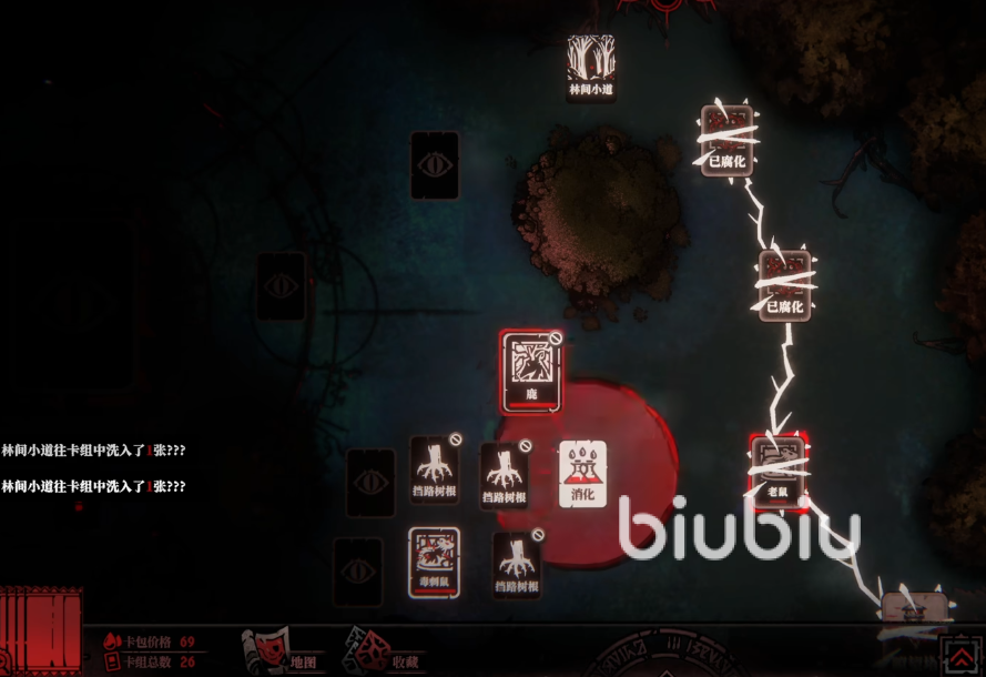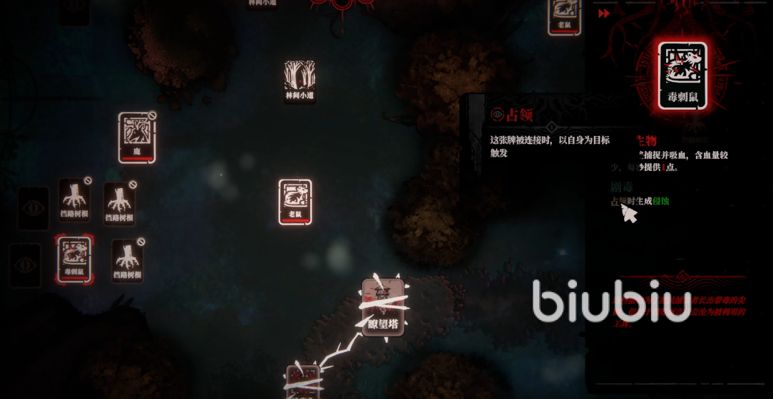 游戏的核心玩法是通过卡牌来不断的开拓新地图和新根系,整个游戏过程中,玩家只需要研究哪个卡牌上的效果能用来推动剧情的帮助,或者是能连接其他角色,获得更多的线索,亦或者是通过连接各类非npc之间的连接从而获得一些关键性的道具。