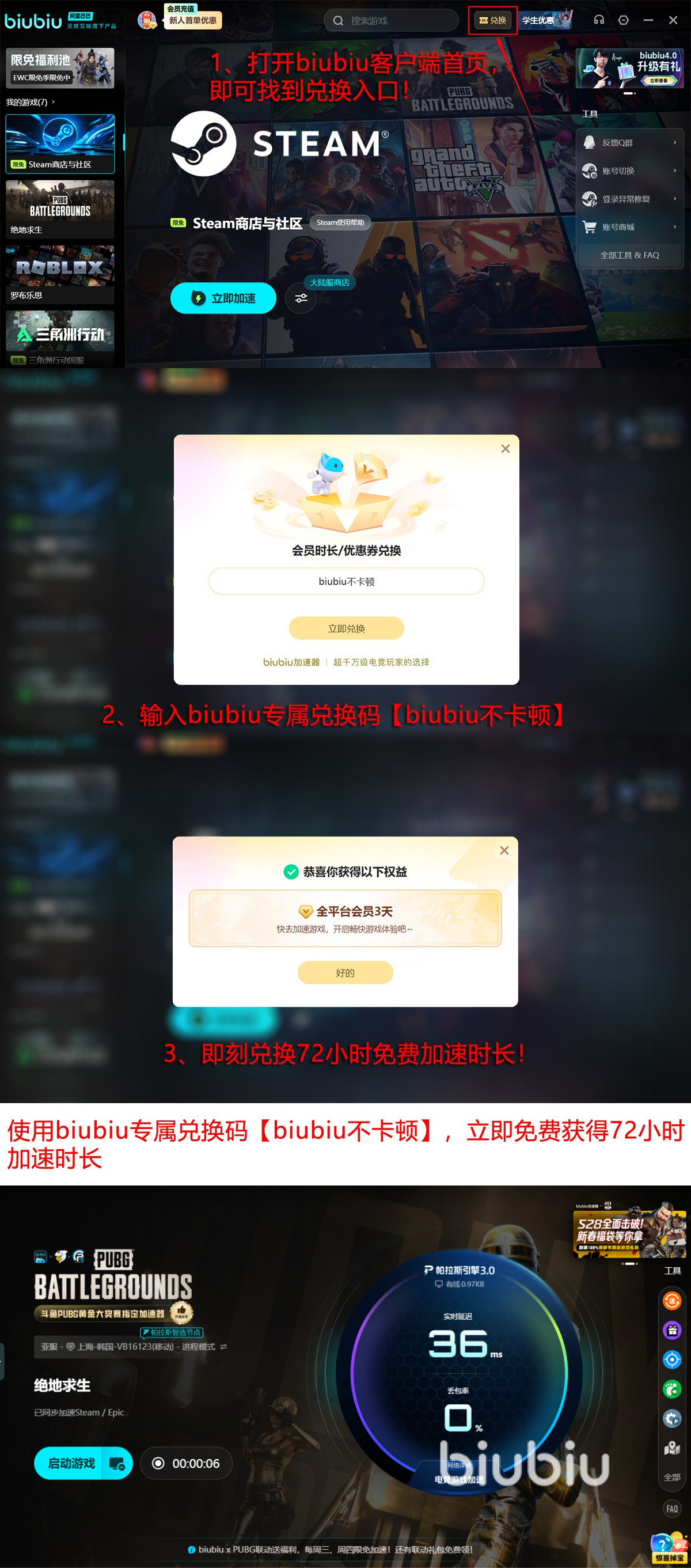 biubiu有着阿里巴巴灵犀互娱大厂技术加持,在技术开发上一直都保持着很高的水平,且在有着这层背景之下,用户们选择起来自然也更加放心,平台足够大,优惠也就更多,就像新用户首次来biubiu注册能领取24小时免费加速,后面新老用户想要体验输入兑换码【biubiu不卡顿】就能再领取72小时,两个福利叠在一起高达96小时的体验时间。