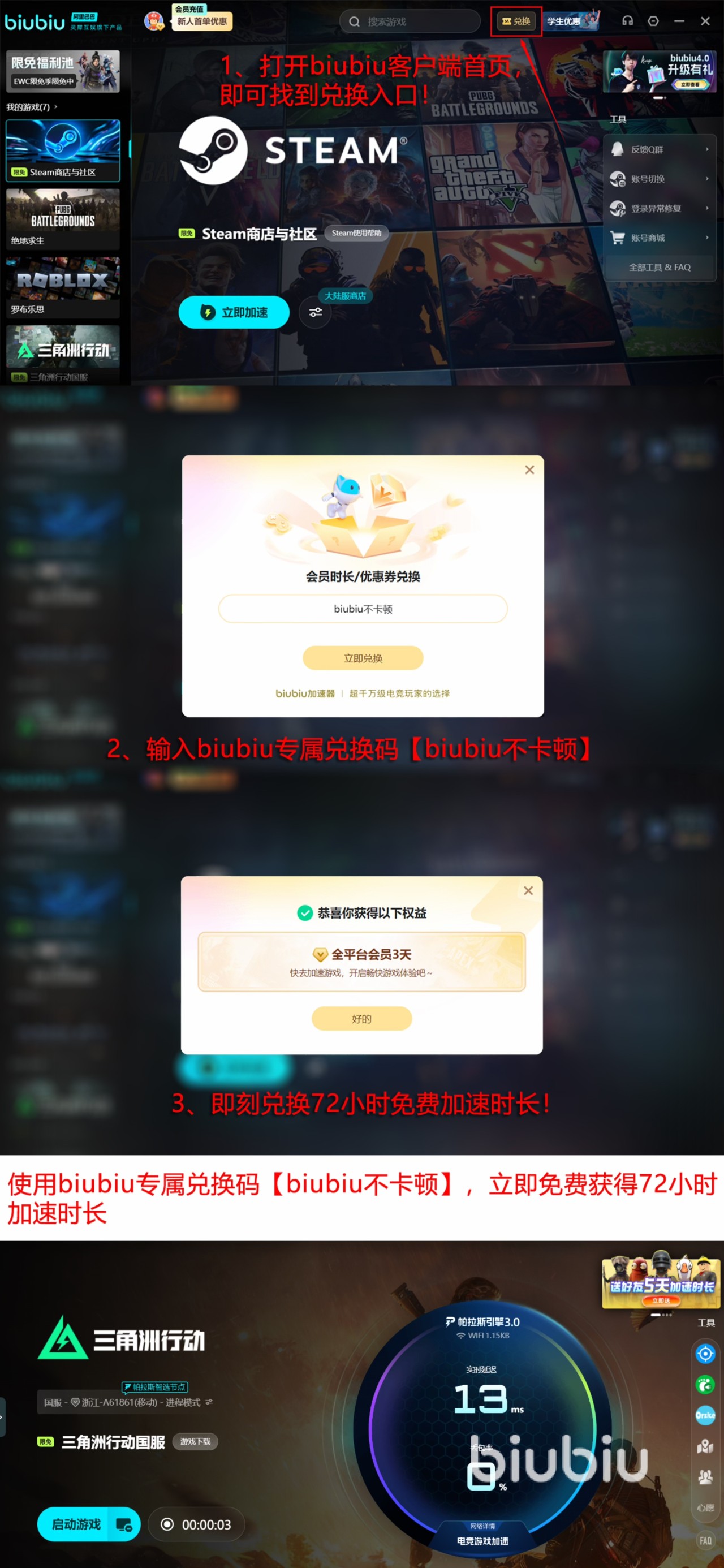 以上就是三角洲行动闪退进不了游戏的分享了,最近这段时间,可是这些游戏在线人数的高峰,想要快速开打的话,少不了加速器来帮忙。这款biubiu加速器还是很值得一试的,就算是冲着加速器上好几天的加速福利也要来试一试。