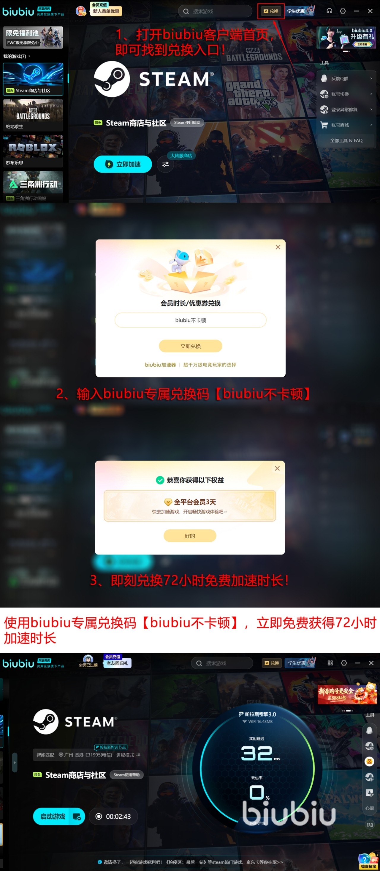 被biubiu专业的电竞线路吸引的朋友可能会担心体验效果,而biubiu也为新人们准备了诚意满满的福利活动!新人们首次注册就送24小时加速时长。偷偷告诉你输入小编的神秘代码【biubiu不卡顿】,新老用户都能领取多72小时加速时长呢。新人这样一算能拿96小时的加速时长,实打实的福利给到手上,体验什么游戏不香呢?