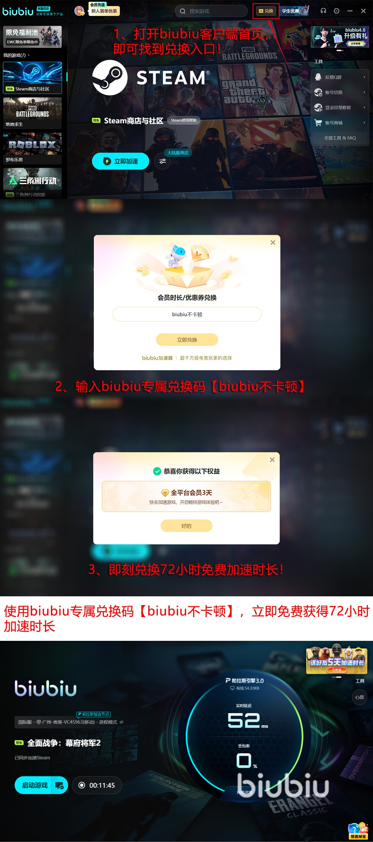 biubiu许多的测试都是在极度高压的情况下去极限测试,就比如服务器运载负荷高、节假日弱网连接、频繁重连重启路由器,在网络本在最脆弱的情况下进行测试,而这类测试还都是与绝地求生世界冠军xdd共同进行,作为biubiu的代言人给出了许多专业性的意见和陪同测试,主要现在的新用户第一次来注册能领取24小时免费加速,后面新老用户输入兑换码【biubiu不卡顿】就能再领取72小时的加速时长,两项福利搭配在一起即可达到96小时的时长。