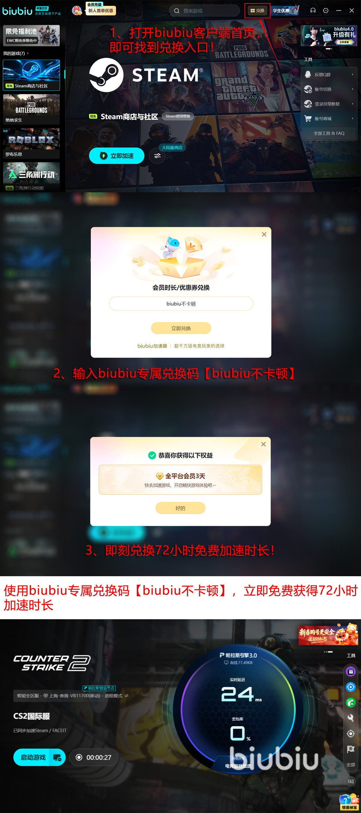 如果是提到竞技性,就不得不提起各种职业比赛当中的高光操作,biubiu为了能让实际体验更加吻合玩家的表现,它也成为了当下pero战队指定加速器,作为绝地求生的世界冠军队伍用其打出了无数的高光表现,同样biubiu在邀请“新同学”上也诚意满满,第一次来注册就能领取24小时免费加速时长,后面新老用户输入兑换码【biubiu不卡顿】即可再领取72小时,两个加起来就有足足96个小时可以让你免费爽玩!