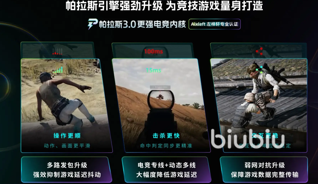biubiu加速优化都是根据用户数据来进行分析,都是在真正开启加速器之后,对比之前的延迟降低频率而进行调整,所以它总是能够在毫秒之间就能拉低延迟提高帧率,帧率变高,延迟变低,从而带来的就是瞄准开火的高敏捷性,整体的射击指令将会变得非常之快,这些都得益于独立自研帕拉斯3.0引擎黑科技,对比之前就已经遥遥领先的引擎系统再次强化升级,也让它奠定了在加速器界较高的位置。