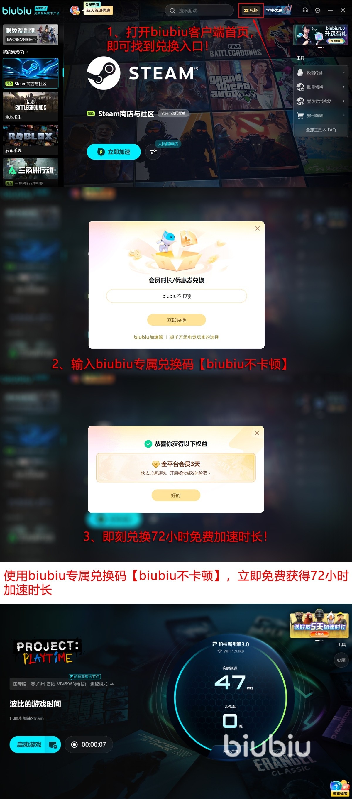 目前官方为新人伙伴准备了丰厚见面礼,首先是完成注册自动到账24小时免费加速时间,无需繁琐操作一点击就能用。而不论你是新用户还是老朋友,输入激活码【biubiu不卡顿】完成验证还能额外的领取72小时的加速权益。新用户将两项福利叠加使用后,总计享受长达96小时的免费加速服务,让大家无门槛轻松体验全程低延迟不卡顿、流畅的游戏氛围。