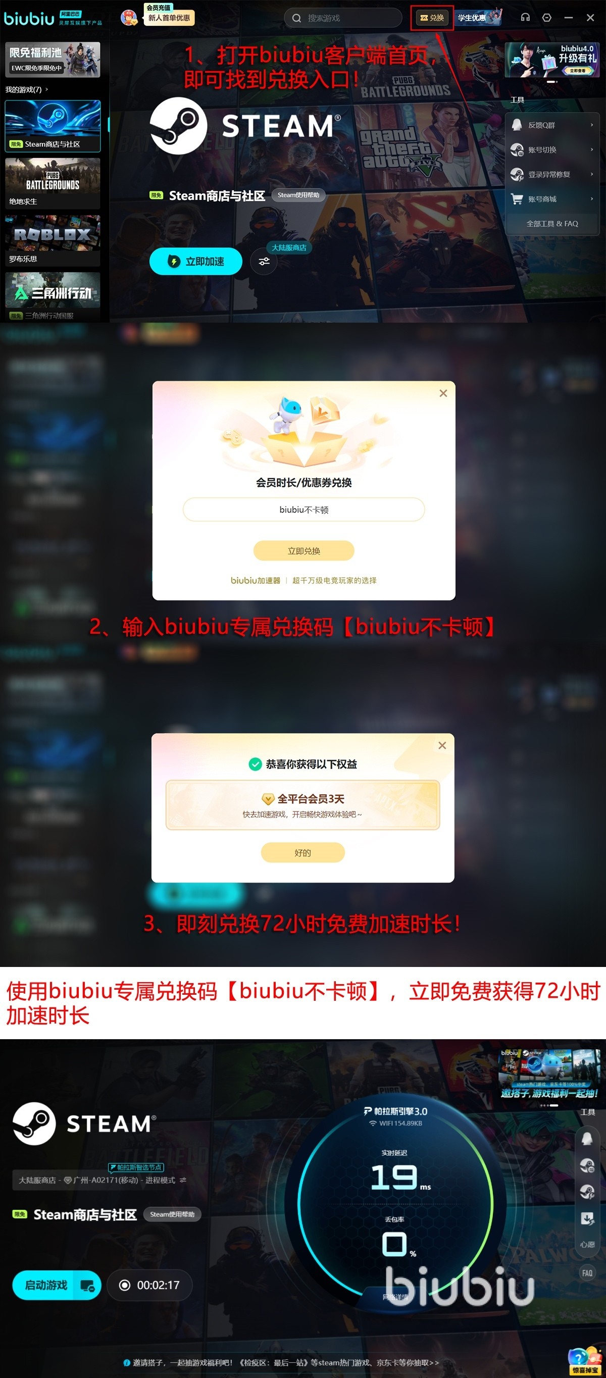 目前平台开放限时的福利活动,首先是新人首次登录,获赠24小时的全功能加速权益。所有的用户输入【biubiu不卡顿】口令码,能够兑换三天免费服务时长,满足你从下载安装到进局内体验的流程。