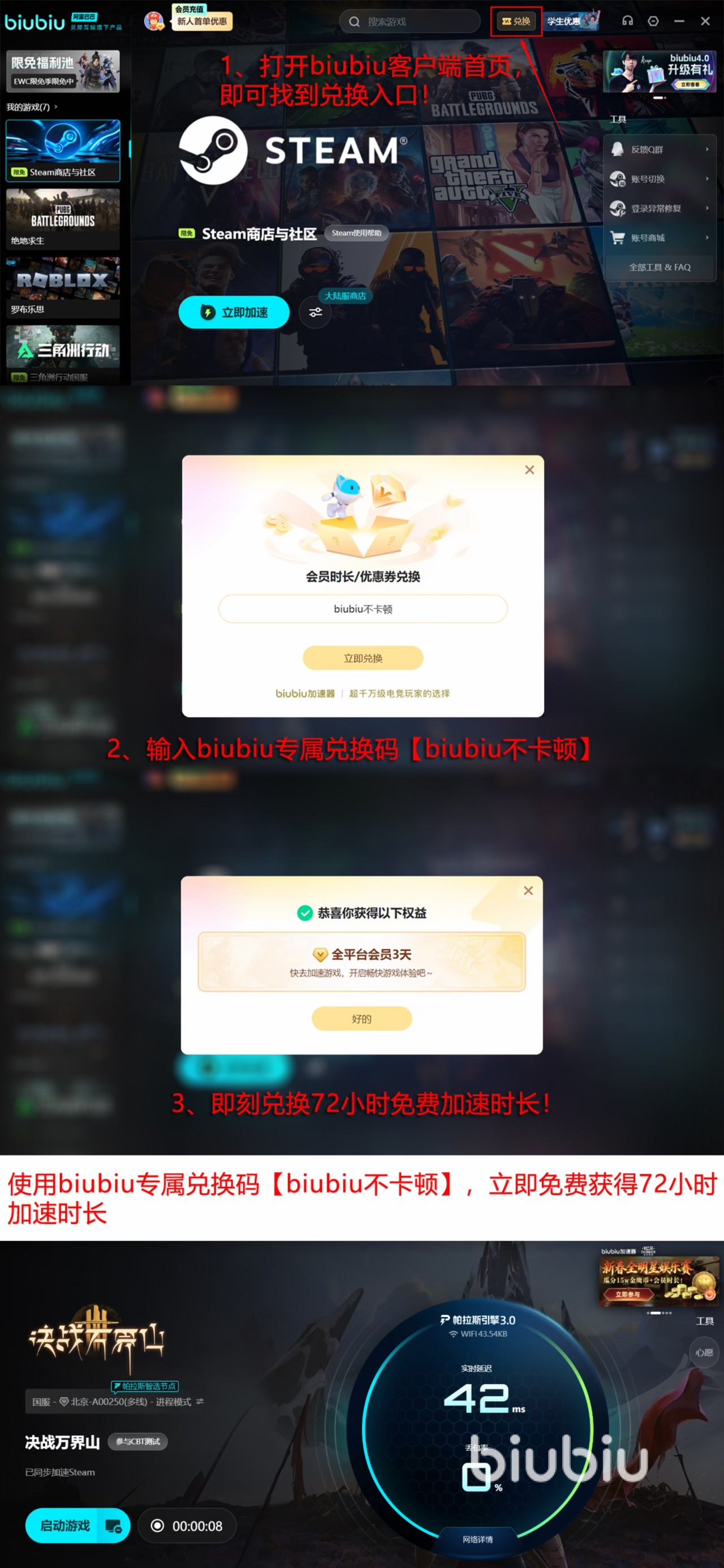这款biubiu的优势绝对不止这些,还有很多的加速福利。比如说第一次使用并解除的玩家们,能直接解锁24h的加速,针对加速器上所有的注册用户,都可以用【biubiu不卡顿】这个口令卡兑换3天的加速。