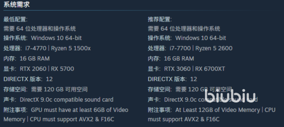 目前来看游戏的最低配置要求还是不高的,一般电脑的机型都可以流畅运行的,其配置方面分别是处理器要求 i7-4770 以上,显卡方面的话在Radeon RX 5700 显卡以上,内存方面最少要12GB 内存,最后的下载空间需要120g,可见游戏本体还是很大的,需要玩家们留存足够的下载空间,如果在游玩期间有一些卡的话,可以适当降低游戏的画质。