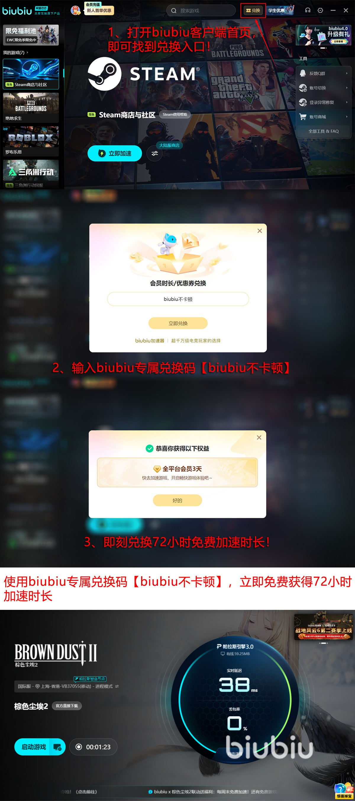 biubiu也希望能成为真正懂玩家的平台,所以还专门找到了绝地求生世界冠军XDD作为代言人,站在专业的游戏角度,方便去感受加速器带来的每一次变换,站在游戏玩家的角度去解决各种网络痛点,在每一次游戏更新后可能出现的网络波动都及时给出方案。而为了能让更多人体验到这些好处,biubiu面向新用户首次注册会赠送24小时免费加速,后面新老用户输入兑换码【biubiu不卡顿】就能再领取72小时加速,总计96小时的超长福利让你假期无忧。