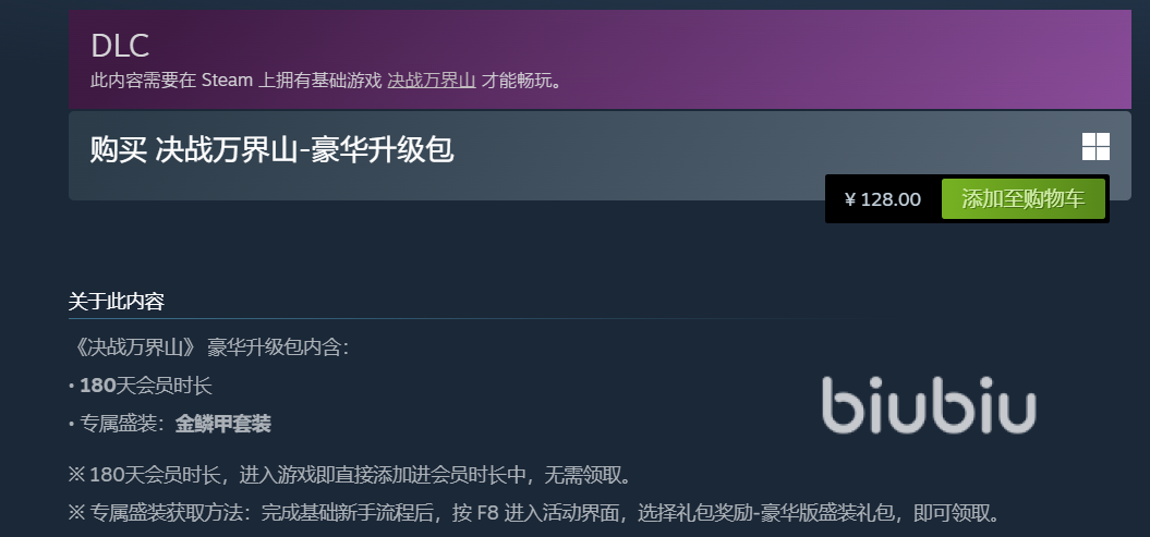 这款游戏已经在steam端上启动了一段时间了,基础的数字安装包是免费的,如果说玩家想要在游戏开局就比其他玩家多一些装备的话,可以考虑游戏的豪华升级包,这个就要128元了,里面包含了6个月的会员时长,还有专属的金鳞甲套装。