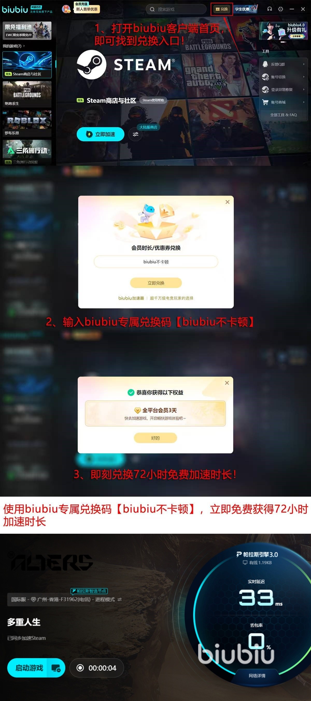 现阶段新人是有着免费加速福利的,第一次进入程序的新人可以获取到24小时的免费加速,除此以外在使用兑换码【biubiu不卡顿】的话还能够额外获取到72小时的免费加速时间。