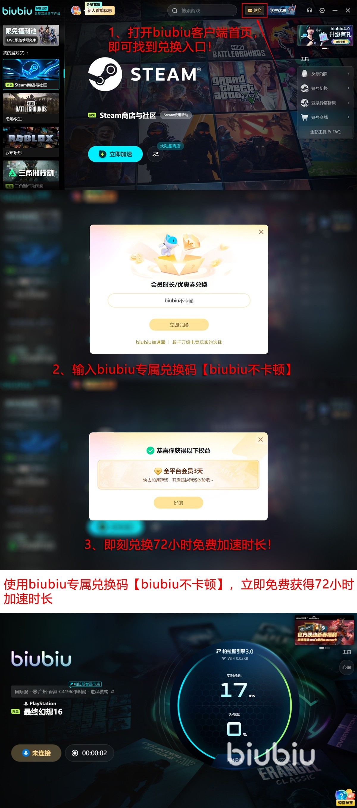 为了让大家畅快玩大作,biubiu官方带来超良心新人礼遇:新注册账号自动到手24小时免费时长。此外,无论新老玩家,带来输入兑换口令【biubiu不卡顿】还能领得72小时加速权益。