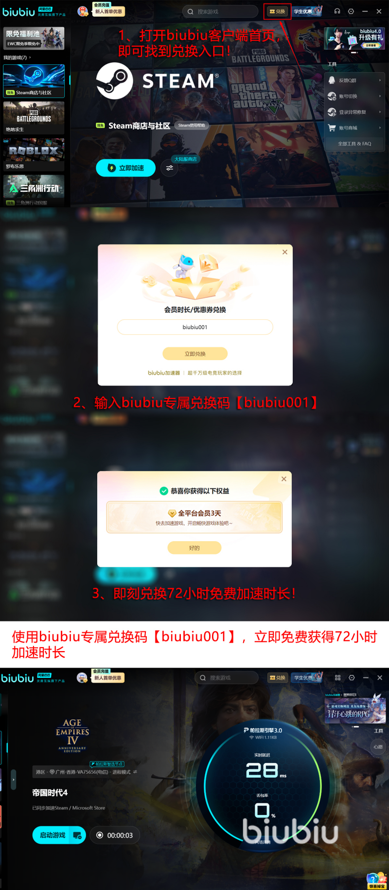 biubiu加速器靠着专业的能力就成为了解决闪退的好选择。这款加速器早就已经得到PUBG冠军选手小叮当的认可,在行业内的影响力真的是不容小看的,除了有帕拉斯3.0引擎之外,还有阿里巴巴灵犀互娱大厂技术。可以规避网络拥堵的路段,创建一个专属的传输通道。现在使用还有免费福利可以领取,如果是新用户在注册之后立马就可以获得24小时加速时长。但要想获取时间更长的加速体验,还可以通过兑换码【biubiu001】领取3天的加速时长,新用户用两种优惠就可以免费96小时。