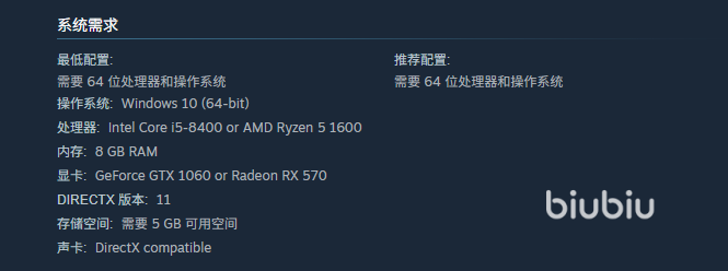 从现阶段官方所给的配置来看,整体游戏对于玩家的要求并不算很高。处理器最低I5的8400即可。内存的话则是需要8G的内存。显卡是GTX1060就行了。容量的话目前5G就行,考虑到之后的一些更新的问题,大家可以预留7G左右的容量就行了。