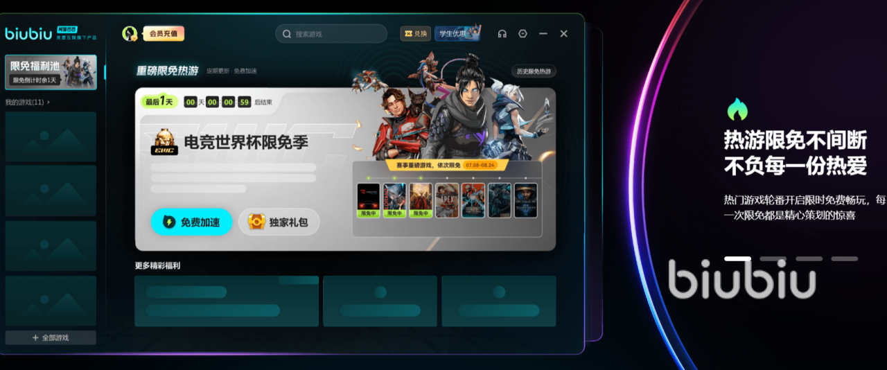 开启biubiu,遇见流畅不卡顿的游玩体验,比对手先手一步,快速响应抢占先机。新人用户注册成功后,登录可获得官方赠送给你的24小时加速体验时间。每位玩家可以使用平台的兑换口令【biubiu不卡顿】,换取三天的加速时间,自由选择想要优化的作品或者平台。