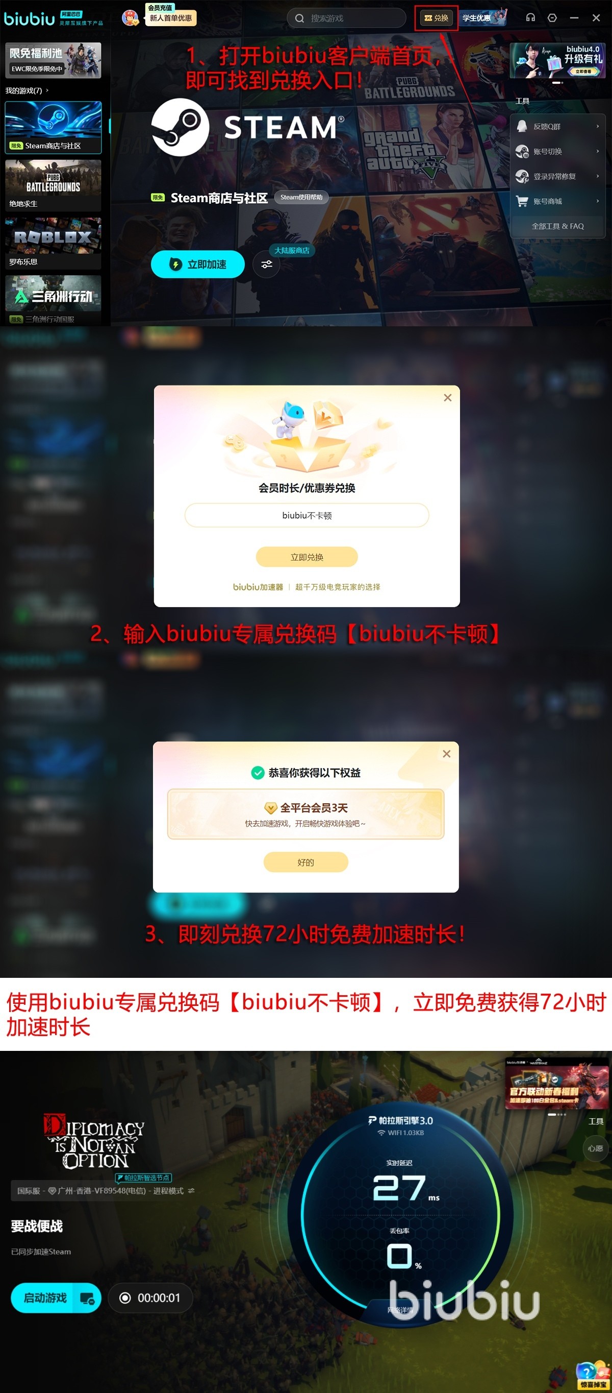 目前所有新老用户可以用兑换码来领取三天的免费加速时间,口令为【biubiu不卡顿】,只要在首页成功兑换就能解锁。如果你从未使用过biubiu,还能再领一份新人见面礼,新注册的账号自动获得24小时免费加速时间,算起来新人就有累计足量96小时的体验时间。