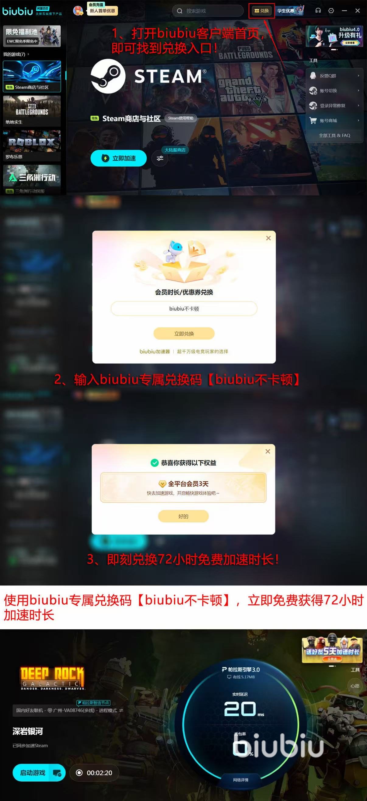 除此之外,biubiu还给新用户赠送24小时免费加速时长,并向所有用户发放3天免费加速福利,只要输入【biubiu不卡顿】就能领取到手。全站资源都能用免费时长来加速,新用户最高可以叠加享受免费时长为96H,不花钱就能体验畅玩游戏的快乐。
