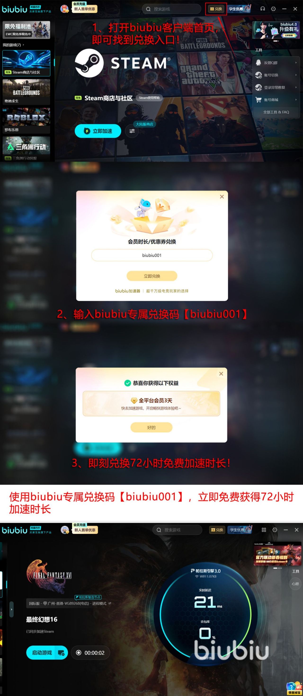 为了能够让更多玩家体验到加速器的诚意,推送出多种福利等你参与使用口令【biubiu001】就能获得72小时免费加速时长,所有新老用户全部都可参与。如果你是新人用户的话,那么可继续额外获得24小时免费加速时长,两种福利叠加在一起长达4天的时间,让你一次性玩个够,在零门槛无损失的情况下,就能获得极品体验。