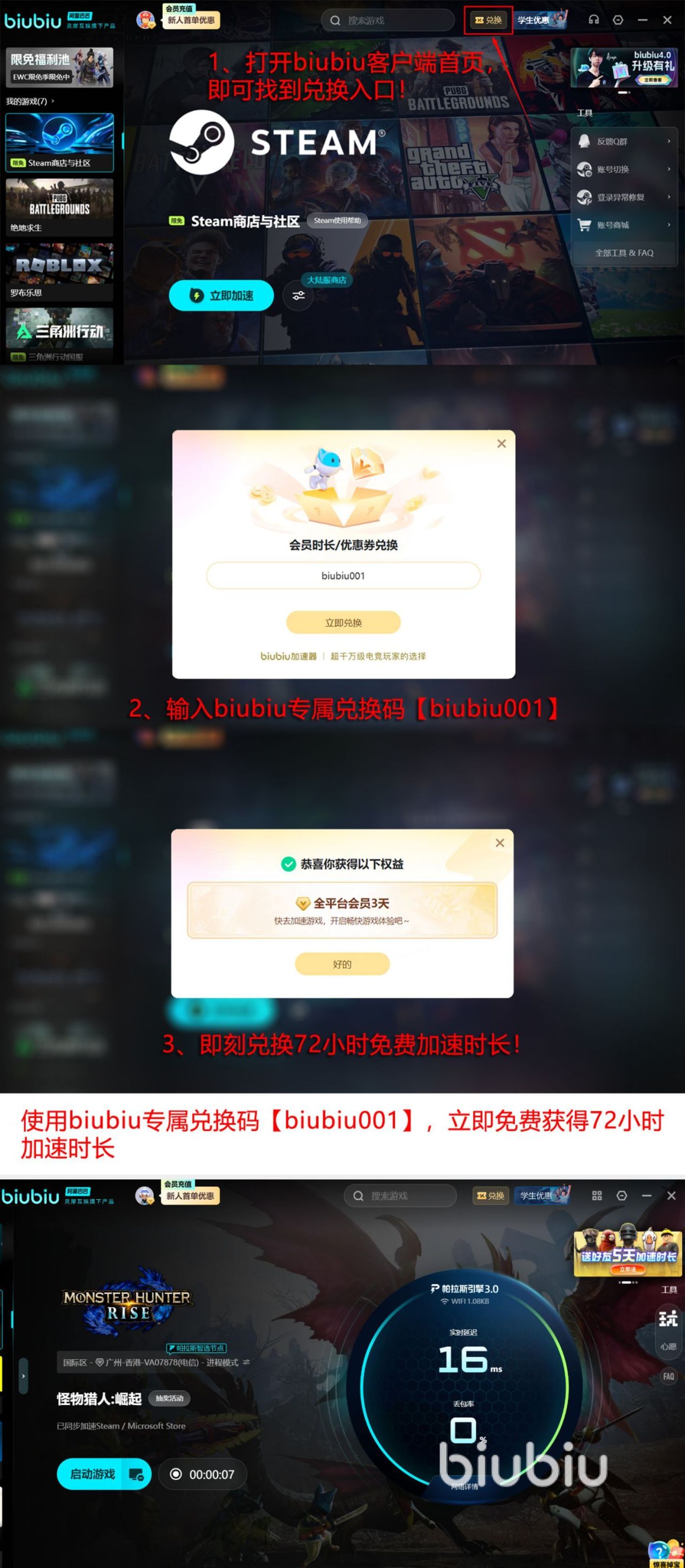目前所有玩家都有机会领取免费试用活动,只要使用口令【biubiu001】即可成功获得72小时免费加速时长,所以偶人都有机会使用一次,如果你是刚注册的新用户,那么可额外获得24小时免费加速时长,两者叠加到一起,成功累积96小时。