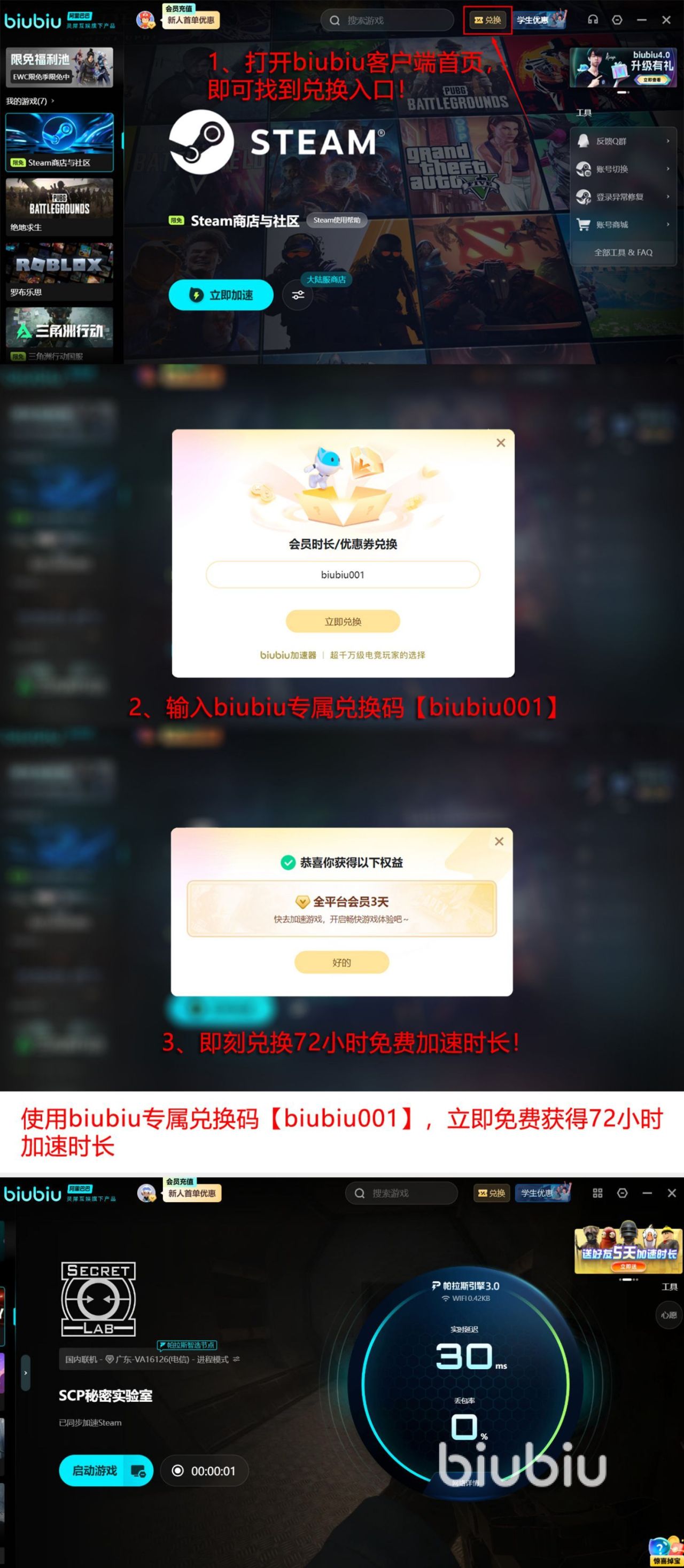 还能利用大数据进行监测,了解网络的波动情况,如果自己所在的网络拥堵的话,也会自行的规化,更加好的通道。毕竟这是由阿里巴巴灵犀互娱所打造的,还搭载了自研的帕拉斯3.0引擎。所以无论是普通的游戏爱好者,还是很多专业的人士都可以使用,早就已经成为了pubg冠军小叮当的推荐,也成为了此工具的代言人,希望更多的人都可以享受电竞级的高速专线,也能够解决闪退以及各种网络原因所造成的问题。如今还能免费体验加速时长,新用户注册以后就能够得到24小时加速时长的福利,新老用户可输入【biubiu001】享受免费三天的加速时长,两种方法加在一起,最多加速96个小时,不得不说,这对于新用户来说,完全能够在免费加速时长当中带来好的体验。