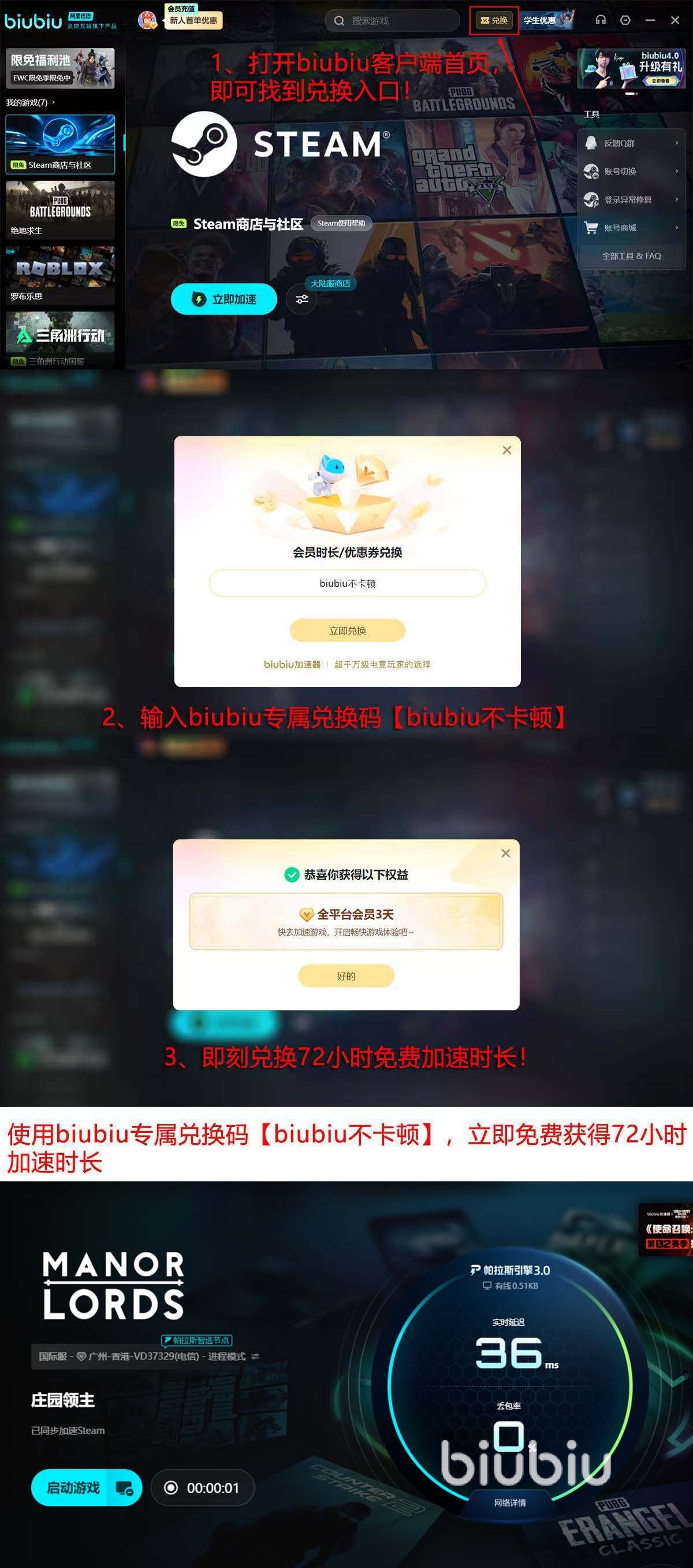 加速性能的提升,对于这种即时策略类游戏,会有显而易见的作用,大家如果想要体验,现在可领取免费时间感受一番,首先是注册后,系统会直接送24小时免费加速时长,这个时间系统赠送无需手动操作,之后,登录完成后的打开首页的“兑换”功能,接着输入【biubiu不卡顿】口令兑换码,就可以在兑得72小时,这样一共就有96小时了。
