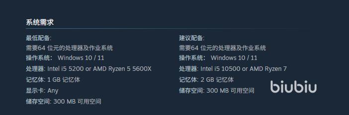 虽然它对硬件的配置需求不高,但还是权且来了解下吧,操作系统这一块最低win10推荐win11。然后是处理器,最低i5-5200或者同级别的amd处理器,运存最低1gb推荐2gb显卡随意,存储空间需求只有300mb,整体而言这个配置需求可以说是极低了。