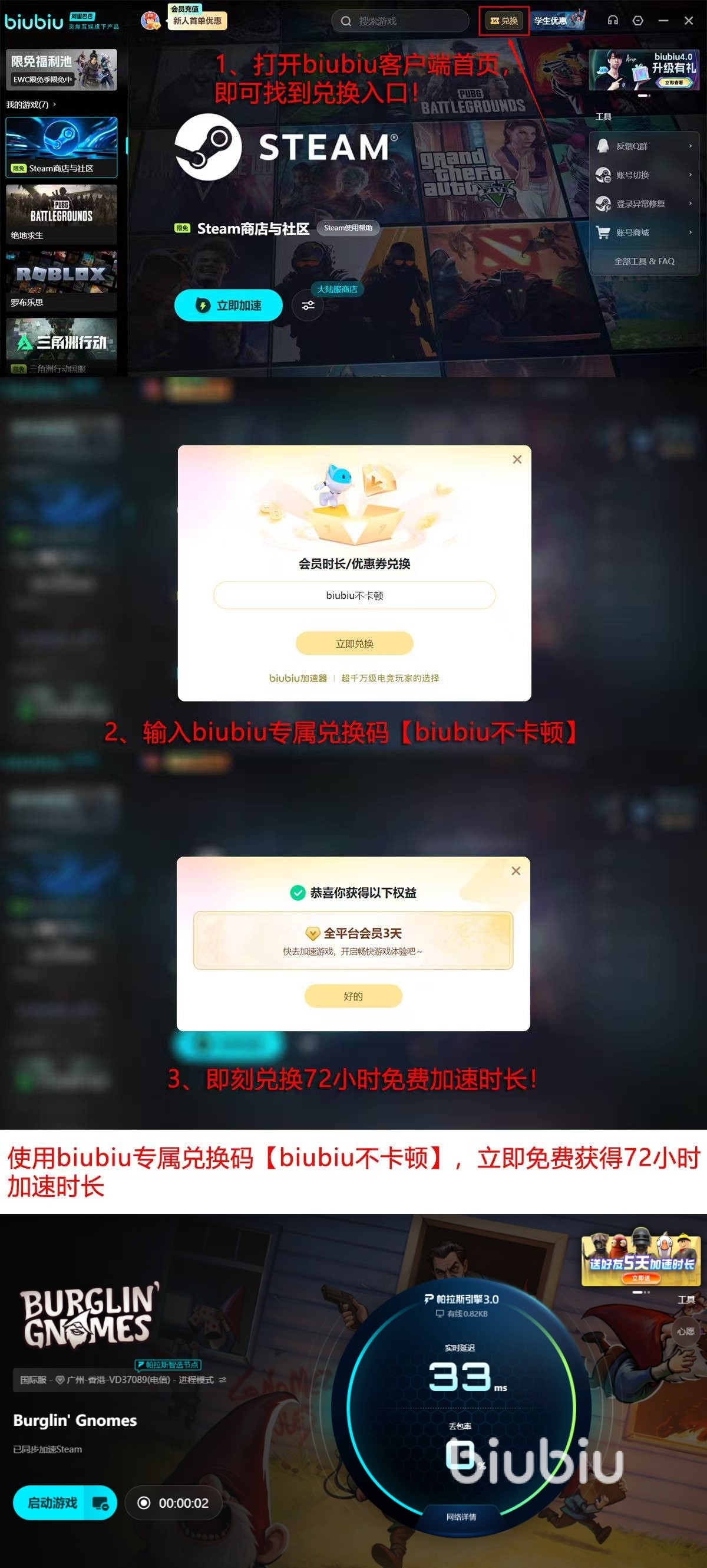 这加速器采用了独立自主研发的帕拉斯3.0引擎,这个引擎的优化下网络加速效果会非常好,这么一来就能进行游戏的购买和后续游玩了,也正因为效果好就和pubg明星冠军选手xdd达成了合作关系,此外除了效果好以外还拥有不错的福利活动,拥有【biubiu不卡顿】兑换码兑换72小时使用时长和新用户注册免费领取24小时使用时间这两项福利,随意推荐大家去使用这加速器。