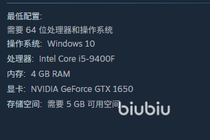 这游戏的话配置要求还不算低,分为最低和推荐两档,首先是最低档的配置要求需要处理达到i59400f的水平、内存需要达到4gb,显卡需要达到1050,这是最低配置要求,之后是推荐配置需要处理器达到i79700,内存达到8g,显卡达到1070。