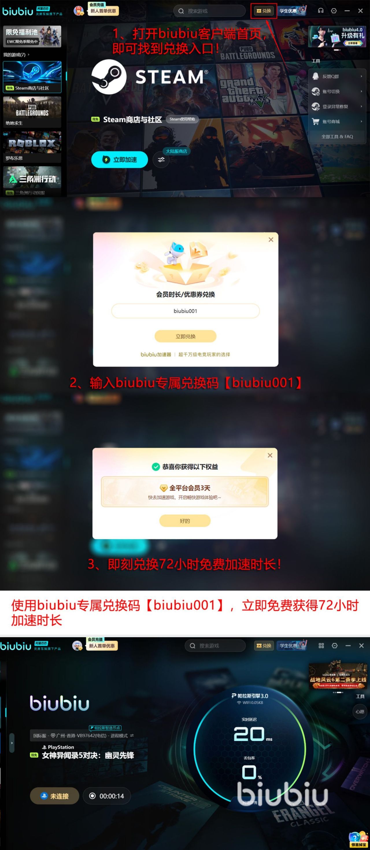 就连很多专业的电竞队伍在日常训练的时候,为了能够避免网络不佳的情况,都会使用这款加速工具。因为它不仅在使用的过程当中能够享受流畅的体验感,也能够在玩各类游戏的时候进行完成很好的加速。除此之外,也有着超强的实力,比如阿里巴巴灵犀互娱所打造,同时自研的帕拉斯3.0引擎也是在行业内非常出色的。如今还有免费赠送加速时长的福利,可以让大家感受一下,新用户,只要注册就可以享受系统赠送的24小时免费加加速时长,对于新老用户来说,则可以通过输入【biubiu001】的方式来获得三天免费加速时长,总计96小时。