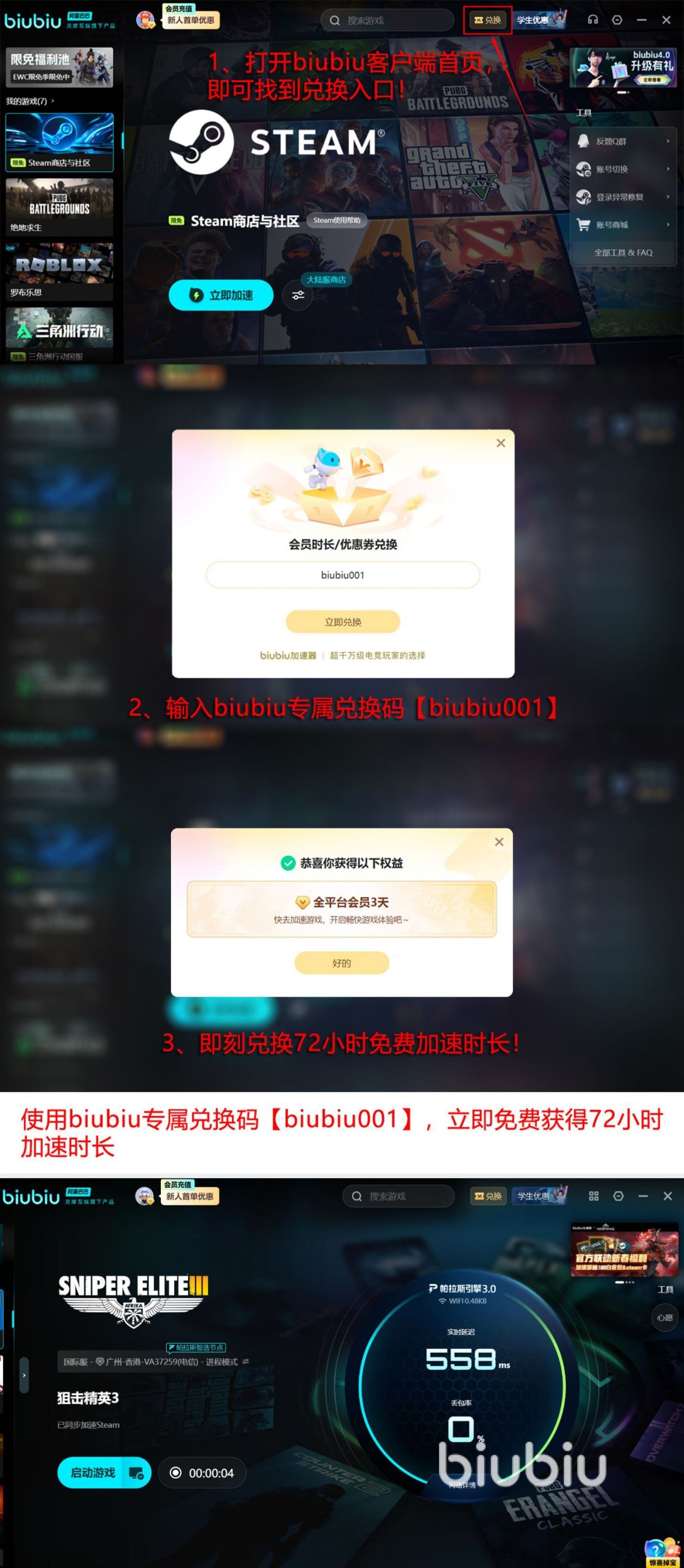 除了如今的游戏具有超强的竞争力,就连在加速器这个方面也是如此,而给大家介绍的这一款不仅背靠阿里巴巴灵犀互娱,而且还有最新一代自研技术所打造的帕拉斯3.0引擎。也因为在玩的过程当中能够享受极高的稳定性,避免卡死甚至是掉线而影响的完成的任务。除此之外,如今的福利可以让所有的用户都能够0元免费加速,因为新用户只需注册以后,就能够得到系统赠送的24小时免费加速时长,新老用户则可以通过兑换码的方式输入【biubiu001】,立刻能够得到系统赠送的,免费三天加速时长。新用户两种方法叠加使用的话,最多可加速96小时。