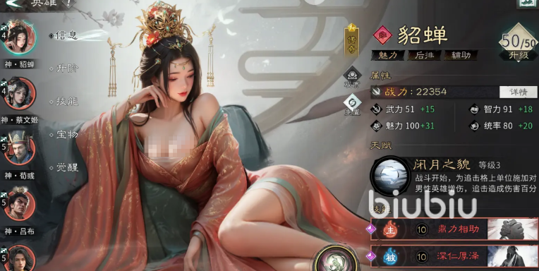 在阵容适配方面,貂蝉存在两大主流体系:其一是以貂蝉、吕布、董卓为核心的“凤仪亭”组合,该队形通过貂蝉强化吕布追击频率与伤害转化率,最大化其单体爆发潜力;其二是以女性武将为主的“红颜协同”体系,其中貂蝉与黄月英形成深度配合,借助黄月英的智力增益与技能联动机制,进一步放大全队谋略输出效能。