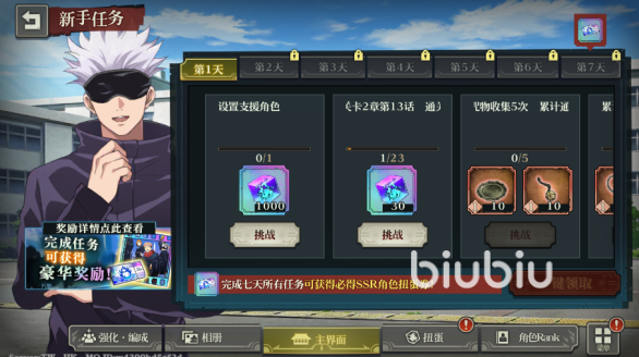 游戏采用3D建模+回合制策略卡牌双核驱动机制,融合高策略性与强节奏感。玩家可收集包括五条悟、虎杖悠仁、伏黑惠等高人气咒术师,以及特级咒灵等关键敌方单位。角色按战斗职能划分为攻击型、强化型、防御型与伤害型四类,稀有度分三个梯度,每位角色均配备独立技能树与差异化成长路径。