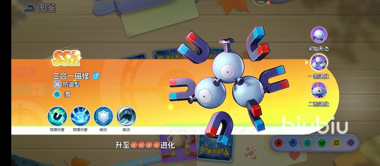 首次进化后成为三合一磁怪,突破单极限制,形成六磁极高速旋转结构。该形态构建起高强度电磁力场,实现伤害分摊与动态防御。不再依赖单一核心承伤,而是通过三体磁力共振实现协同抗压,大幅提升生存阈值。在实战中既能承担前排坦位职责,亦可为队友提供持续覆盖的安全缓冲区。