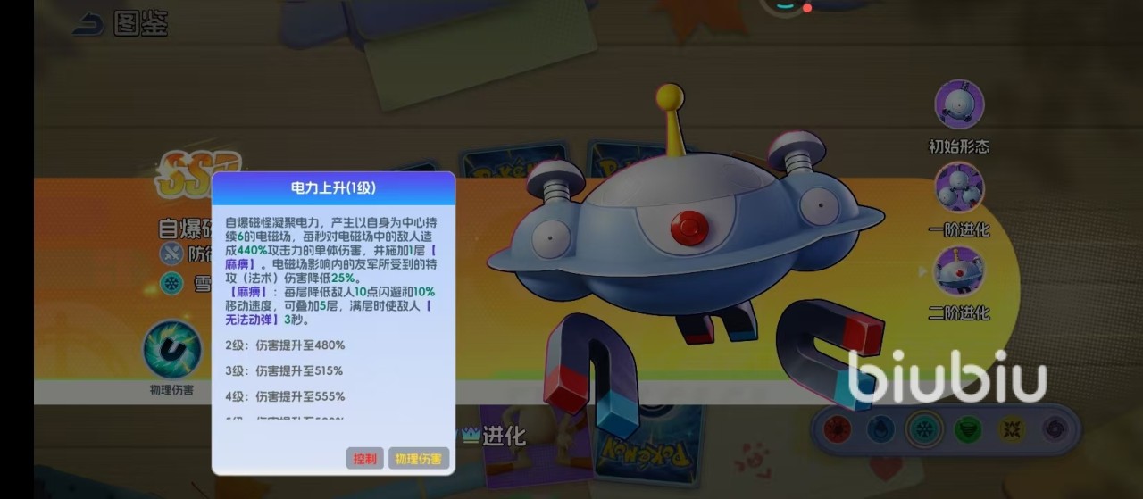 最终形态为自爆磁怪,完成三核心融合,中央红色主核呈现脉动式能量输出。核心技能“电力上升”为其标志性能力:以自身为中心展开持续6秒的电磁领域,每秒对范围内目标造成440%攻击力的单体伤害,并附加麻痹效果。该技能兼具输出与控场双重职能——除直接伤害外,还可降低目标25%守护值,且麻痹状态随持续时间叠加,满层时触发3秒完全禁锢,显著影响战局节奏与胜负走向。