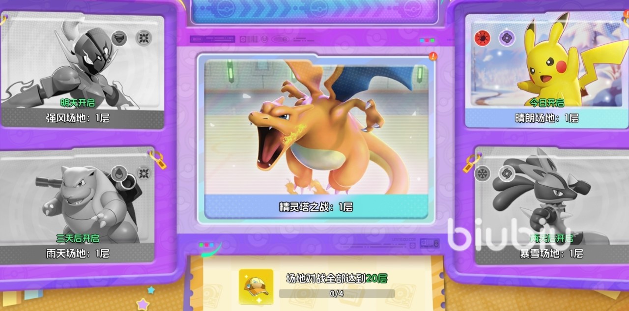 二者核心差异在于出战限制逻辑:“精灵塔之战”无阵营约束,全图鉴宝可梦均可自由编队;而“场地对决”则严格绑定当日开放的环境类型,例如晴朗场地仅允许晴阵营与幻阵营宝可梦登场。该模式每日仅限一种场地轮换开放,其余场地处于锁定状态,但各场地独立保存通关进度,关闭期间不会清空已达成层数。