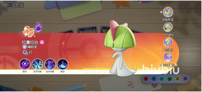 拉鲁拉丝为初始形态,体色纯白,头部覆盖绿色头巾状结构,整体造型清新灵动。在战斗中承担基础辅助职责:可释放范围性超能力技能进行兵线压制,以中低频次法术伤害持续消耗敌方单位血量;被动效果可为邻近队友提供基础属性加成,在前期对线阶段即可通过技能覆盖优势协助队友建立压制节奏,是新手训练家入门幻系辅助的理想选择。