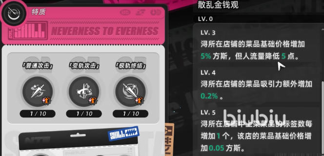 在LV.3阶段,“散乱金钱观”可使浔驻店时,店内所有菜品售价提升5%。这一增幅看似直接有效,但同步触发的负面效果是:店铺人流量下降5点。这意味着收益变化并非线性增长,而是取决于当前客流基数、客单价结构及顾客留存率。例如,在高复购率的老牌店铺中,小幅提价可能被稳定客源消化;而在新店冷启动期,则需谨慎评估该等级的实际适配性。