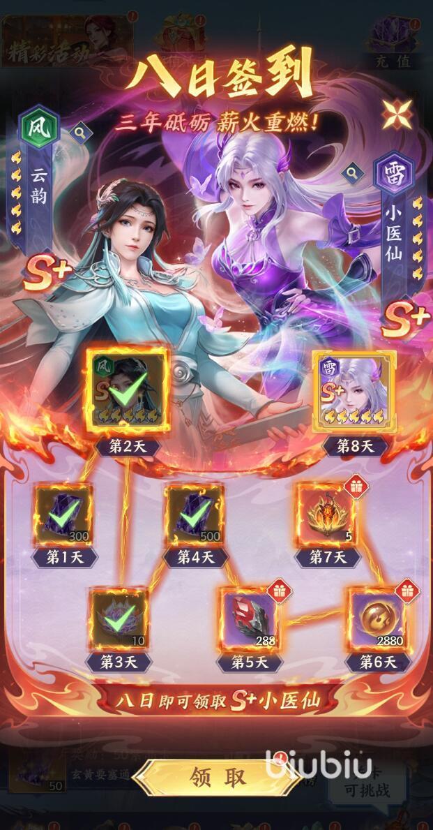 进入中段周期,资源类型向高阶转化:第五日发放288个红色材料,适用于角色升星、装备精炼等关键养成节点;第六日给予2880点核心资源,为角色突破、天赋激活提供充足储备;第七日产出5枚指定等级装备碎片,集齐后可合成完整装备,显著提升属性面板;最终第八日解锁小医仙,其毒伤叠加与群体控制能力,可与云韵形成“复活+持续压制”的强力配合体系。