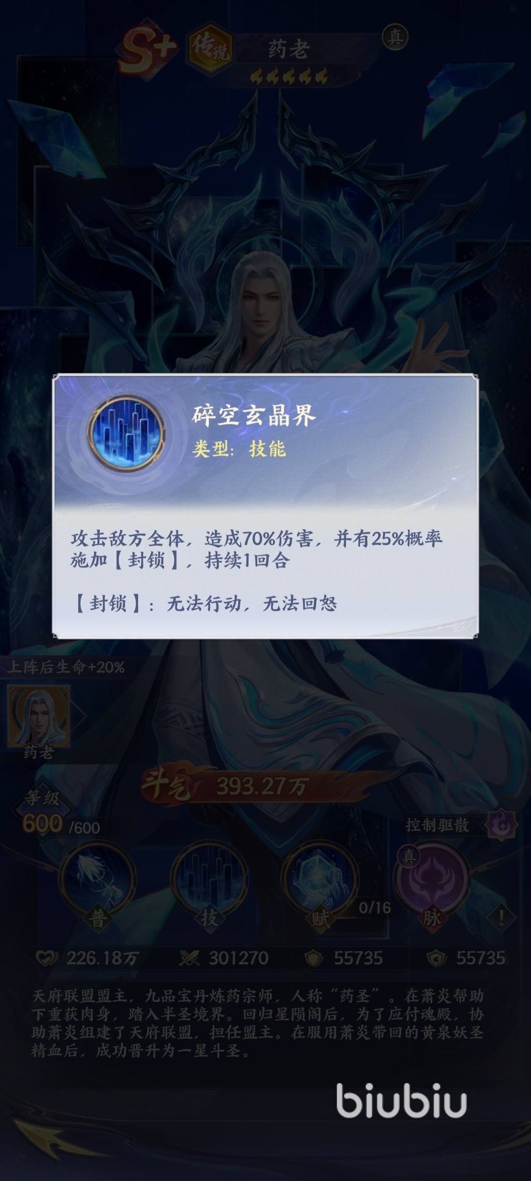 核心大招“碎空玄晶戒”是药老战术价值的核心体现。该技能可对敌方全体目标造成显著范围伤害,并附带概率性“封锁”效果——被封锁单位将无法执行任何行动(含普攻、技能释放及怒气回复),直接打断敌方关键循环。这一机制使其成为对抗高爆发输出或强力治疗阵容时的首选反制手段。