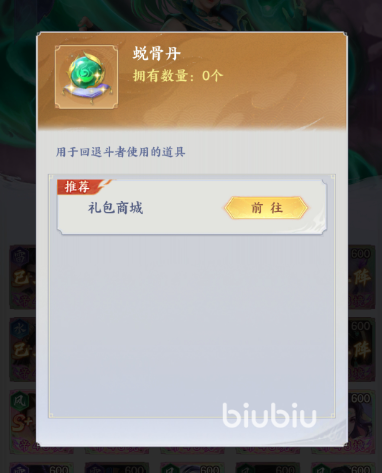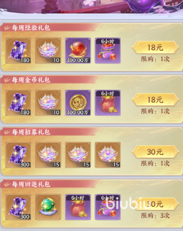 当前蜕骨丹的主要稳定获取渠道为礼包商城中的“每周回馈礼包”。该礼包定价30元,每周限购三次,每次购买可获得1枚蜕骨丹,并额外附赠2个6小时资源袋及300紫晶。对处于阵容重构期或测试多路线培养方案的玩家而言,该礼包具备明确的成本效益优势——既保障回溯操作的可行性,又同步补充短期资源缺口。