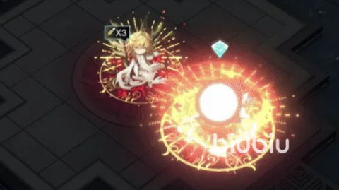 在职业体系中,太阳神鸟定位为战略职业,品质为特出器者,承担远程构素输出与战术协同双重职能。基础普攻【熔金】对单体目标造成基于自身攻击力的构素伤害;主动技能【齿芒环旋】为核心节奏引擎——释放后进入“天时往复”状态,同步填充礼弹并激活警戒模式,在指定范围(3×3格)内自动索敌攻击,每次命中消耗1枚礼弹,礼弹耗尽则警戒终止。