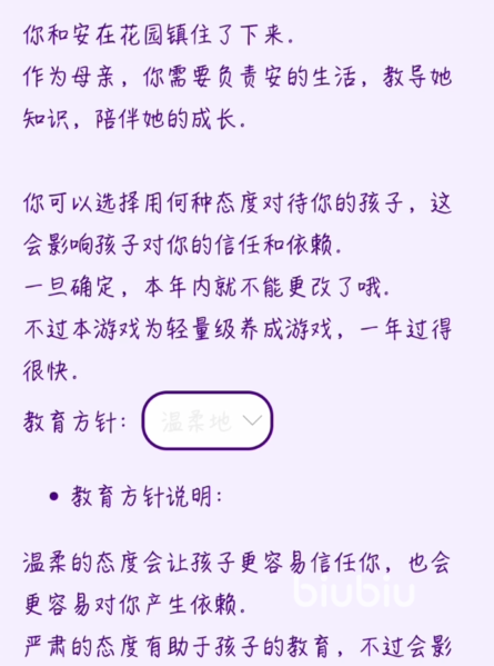 游戏核心玩法围绕“养育关系构建”展开:通过日常互动、事件抉择、资源分配等方式逐步提升与每位孩子的亲密度。每位孩子拥有独立成长线与专属结局,故事风格涵盖温暖治愈、哲思深沉、悲悯动人等多种维度,整体叙事层次丰富且富有文学质感。