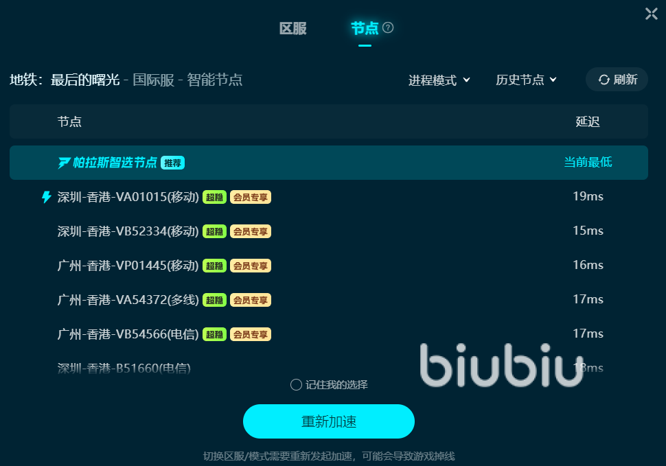 针对海外服务器部署的游戏内容,biubiu加速器采用多节点动态负载均衡技术,实现毫秒级连接切换。其“帕拉斯智选节点”功能专为会员开放,可自动识别当前网络环境特征,实时匹配最优传输链路,避免人工选线误差,保障长期稳定低延迟连接。