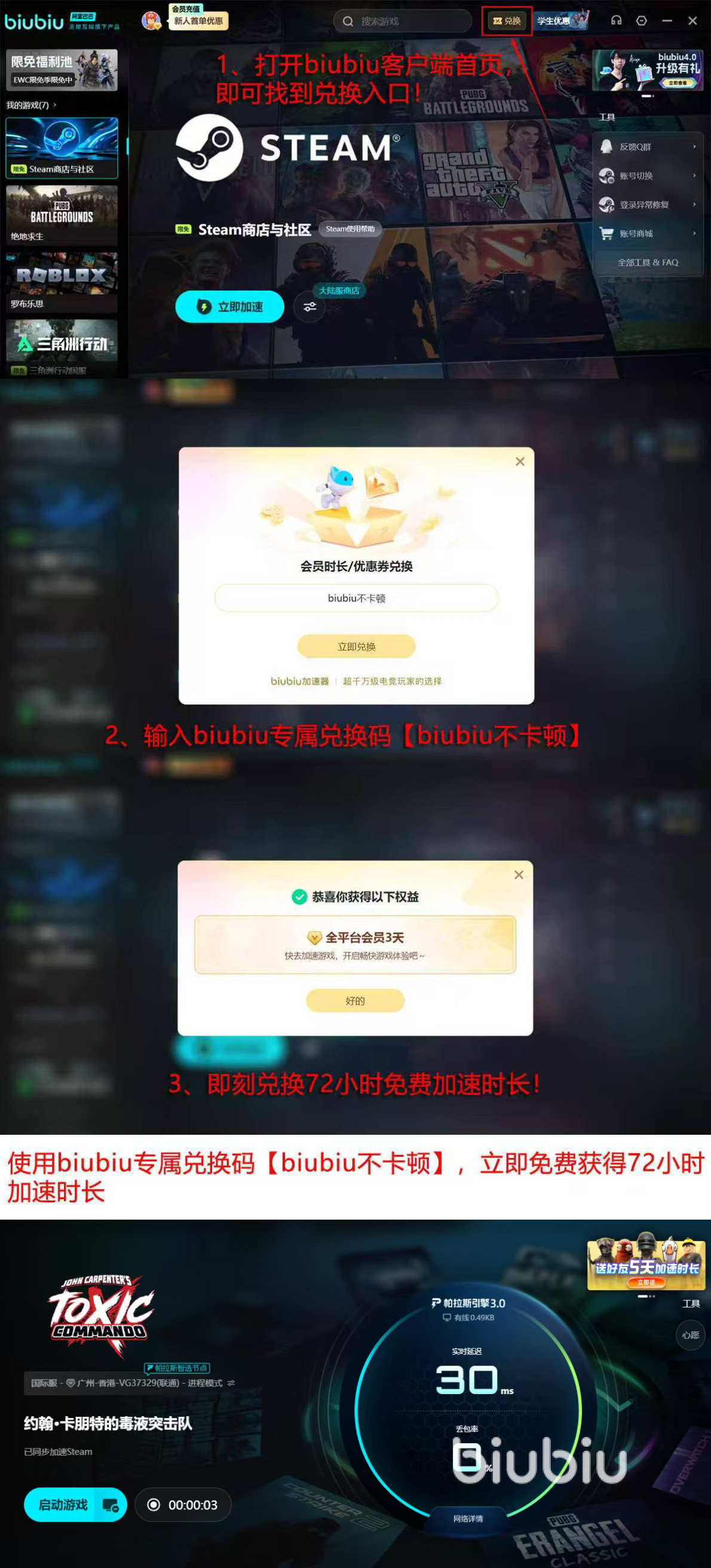 另外说个大家可能感兴趣的点,biubiu是XDD小叮当代言的,就是那个拿过PUBG冠军的小叮当,他自己打比赛、日常玩游戏,用的也都是这款加速器,能被职业选手认准,实力肯定没话说。它还有自己独立自研的帕拉斯3.0引擎,实际用起来能明显感觉到不一样,稳定性拉满。新人福利也很实在,首次注册直接送24小时免费加速,输入兑换码【biubiu不卡顿】还能再领72小时,加起来一共96小时,差不多四天的免费试用时间,先体验再决定,让玩家深刻感受到biubiu加速器的贴心。